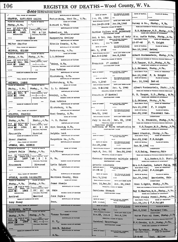 Register of Deaths Book, Wood County, West Virginia Before this image was available, the information on the page was previously copied directly from the book by Teresa Fordyce, and forwarded to me by e-mail. See the "Notes" section for that information. |