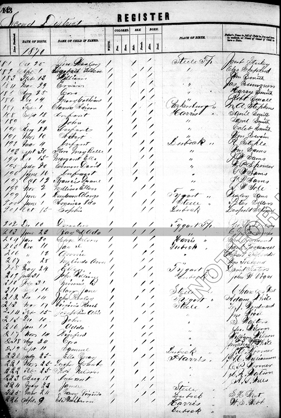 Register of Births Book, Wood County, West Virginia Page 143, Line 203 (left side) - Date: 23 Jun 1870; Name of child(ren): Ray and Ada; Place: Tygart County; Name of father: C. J. Tavenner |