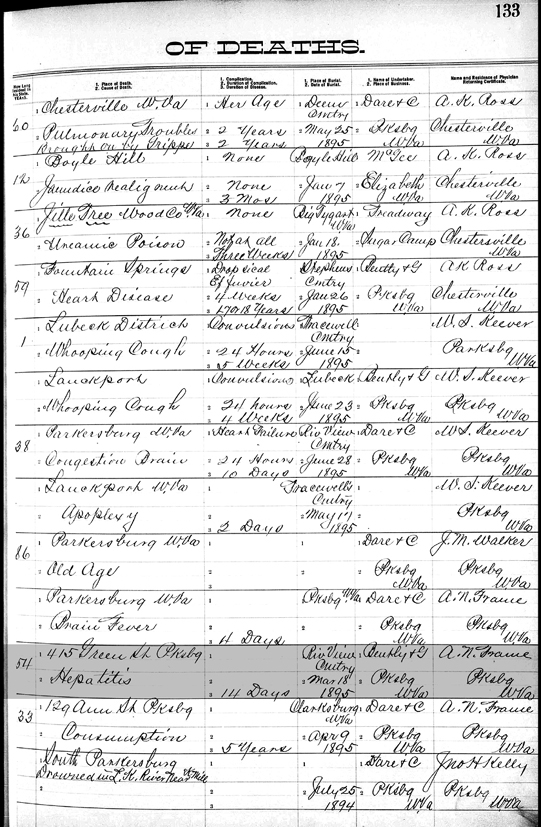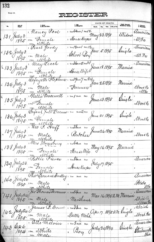 Register of Deaths Book, Wood County, West Virginia Before this image was available, the information on the page was previously copied directly from the book by Teresa Fordyce, and forwarded to me by e-mail. See the "Notes" section for that information. |