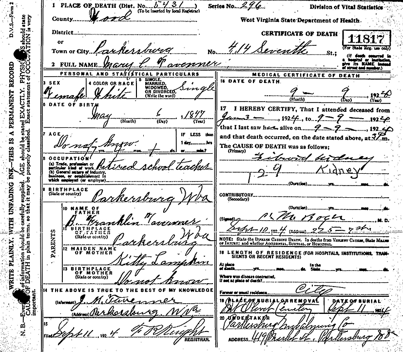 Mt.Olivet Cemetery, Parkersburg, Wood County, West Virginia Gravestone for Mary Catherine Tavenner. (Photo contributed by Crystal Gywnn) |