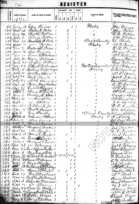 Original Register of Births Book, Wood County, West Virginia Page 372, Line 126 (left side) - Date: 8 Sep 1894; Name of child: Louisa Tavenner; Place: Parkersburg; Name of father: L. N. Tavenner |