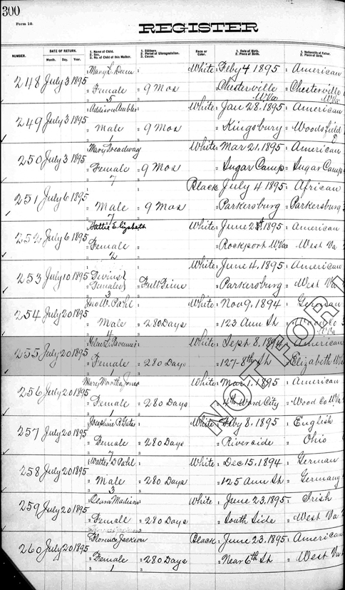 Register of Births Book, Wood County, West Virginia Pages 300-301, Line 255 (left side) - Date of return: 20 Jul 1895; Name of child: Helen L; Sex: Female; Number of child of this mother: 1; Date of Birth: 8 Sep 1894; Place of Birth: 127 8th Street |
