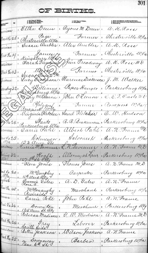 Register of Births Book, Wood County, West Virginia Pages 300-301, Line 255 (right side) - Age of mother: 32; Full name of mother: Carrie M. Kraft Tavenner; Full name of father: L. N. Tavenner; Occupation: Attorney at Law; Name of medical attendant: A. N. France MD (or A. N. Frame MD) |