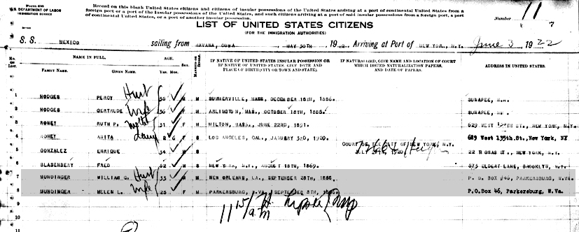 Passenger List of S.S. "Mexico" William George and Helen Louise Mundinger listed on the S.S. "Mexico", departing Havana, Cuba, 30 May 1922 and arriving in Port of New York, 3 June 1922. |