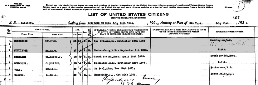 Passenger List of S.S. "Cananova" William George and Helen Louise Mundinger listed on the S.S. "Cananova", departing Santiago De Cuba, 12 July 1924 and arriving in Port of New York, 21 July 1924. |