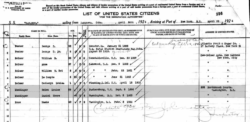 Passenger List of S.S. "Cananova" Helen Louise and Daniel Moore Mundinger listed on the S.S. "Cananova", departing Cananova, Cuba, 24 April 1926 and arriving in Port of New York, 28 April 1926. |