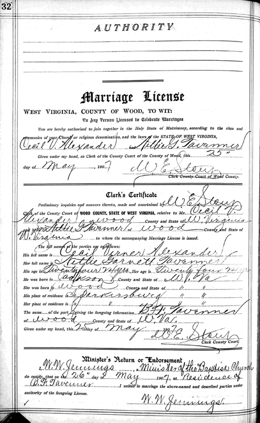 Marriage License of Cecil V. Alexander and Nettie G. Tavenner Marriage Application, License and Minister's Return Form of Cecil Verner Alexander and Nettie Garnett Tavenner. Dated and filed on 25 May 1907. Marriage performed on 26 May 1907 by Baptist Minister W. W. Jennings at the residence of B. F. Tavenner. |