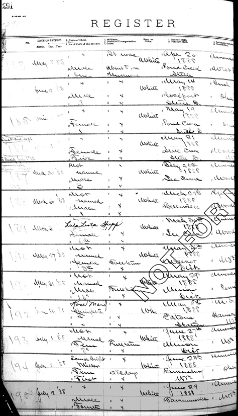 Register of Births Book, Wood County, West Virginia Pages 291, Line 195 (left side) - Date of return: 2 Jul 1888; Name of child: (not filled in); Sex: Male; Number of child of this mother: 4; Date of Birth: 29 Jun 1888; Place of Birth: Tavennersville |