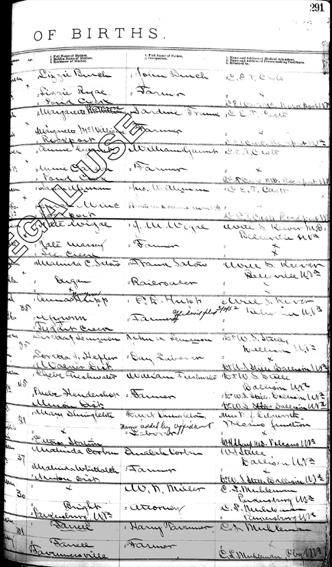 Register of Births Book, Wood County, West Virginia Pages 291, Line 195 (right side) - Age of mother: 31; Full name of mother: Farrell; Maiden name of mother: Farrell; Residence: Tavennersville; Full name of father: Harry Tavenner; Occupation: Farmer; Name of medical attendant: C. L. Muhleman |