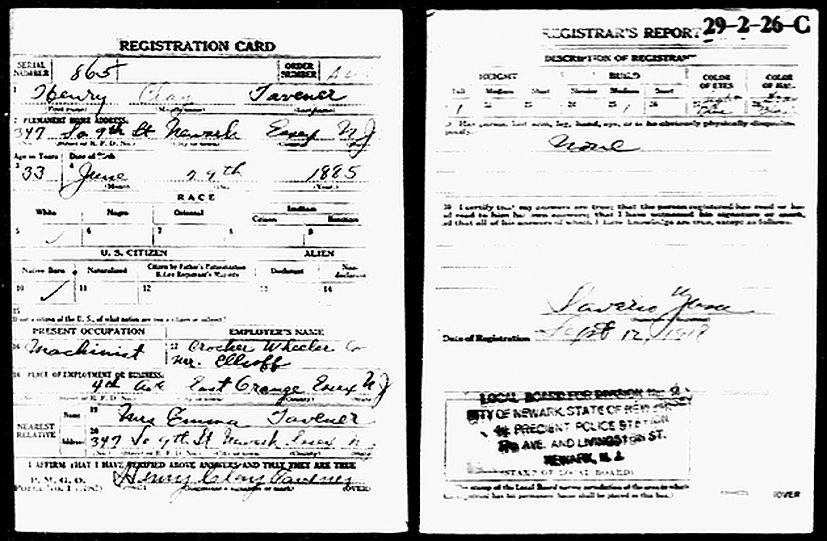 World War I - Military Registration Card Draft Card for Henry C. Tavener. |
