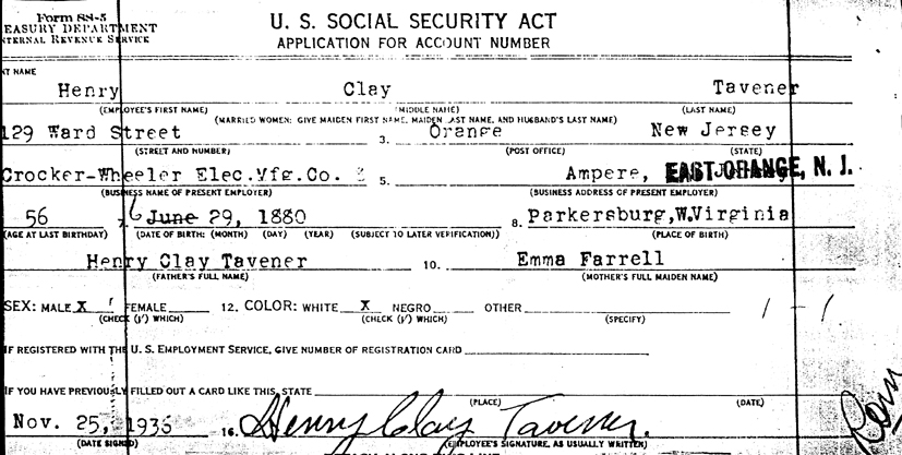 Social Security Application Form Copy of the original application, signed by Henry Clay Tavener (Sr.) on 25 Nov 1936. |