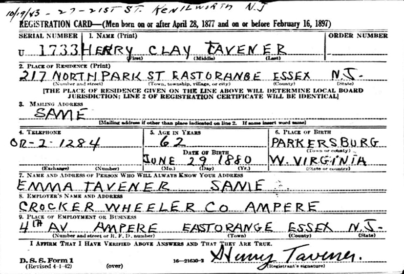World War II - Military Registration Card Draft Card for Henry C. Tavener – from 1942. |