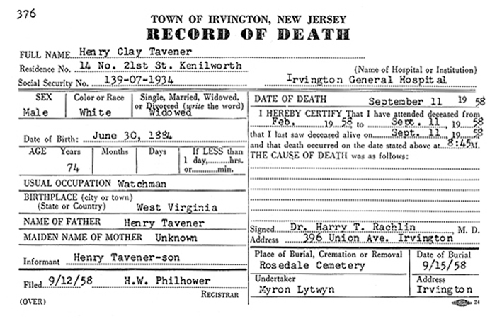 Record of Death Copy obtained from Office of the Registrar of Vital Statistics, Township of Irvington, Essex Co., New Jersey. |