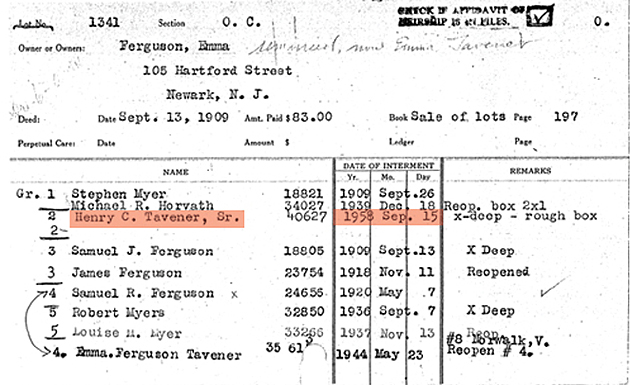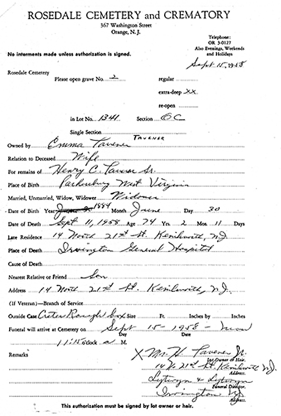 Marriage Certificate Henry Tavener (Sr.) + Emma Ferguson Certified copy obtained from New Jersey Department of Health and Senior Services, Bureau of Vital Statistics. |