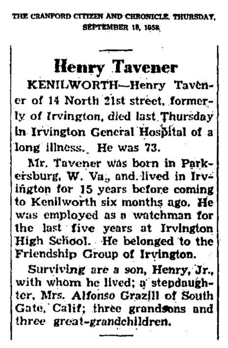 The Cranford Citizen and Chronicle Newspaper Newspaper obituary notice for Henry Clay Tavenner, dated 18 September 1958. |