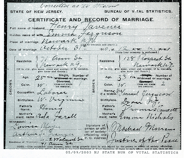 Marriage Certificate Henry Tavenner (Sr.) + Emma Ferguson Certified copy obtained from New Jersey Department of Health and Senior Services, Bureau of Vital Statistics. |