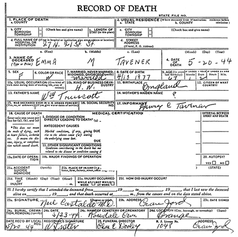 Record of Death Copy obtained from Department of Health, Kenilworth, Union Co., New Jersey. |