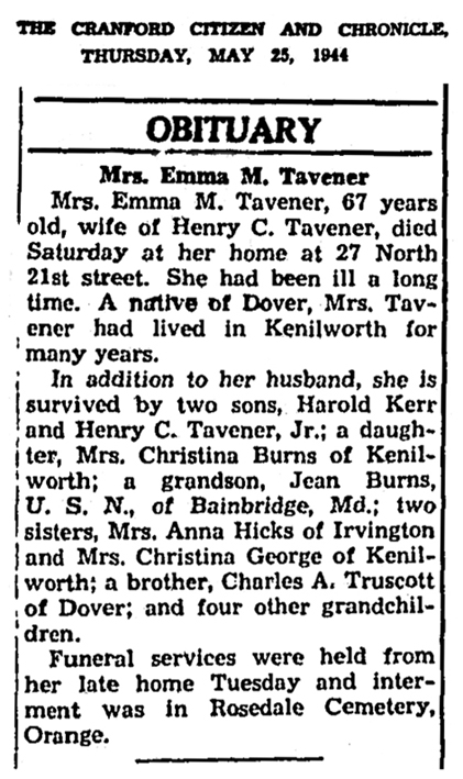 The Cranford Citizen and Chronicle Newspaper Newspaper obituary notice for Emma May (Truscott) Ferguson Tavenner, dated 25 May 1944. |