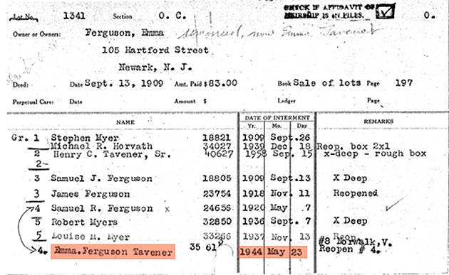 Plot in Rosedale Cemetery, Orange, Essex Co., N.J. Members of the following families are interred in the plot: Ferguson, Myer (headstone), Horvath and Tavener. (See front of Interment Card for full names and dates.) This picture shows the approximate size of the plot. |