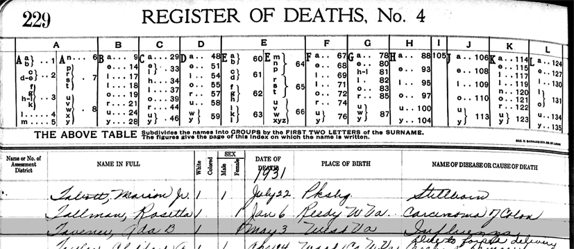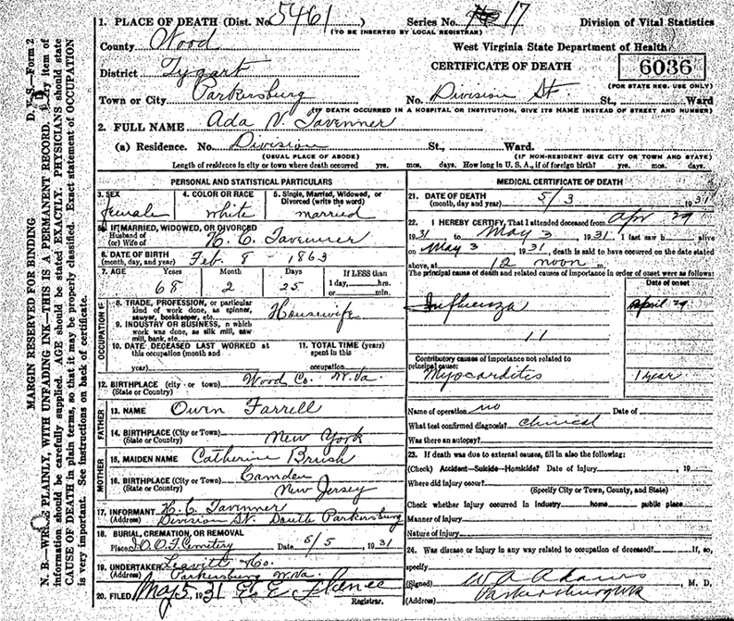 Register of Deaths Book No. 4, Wood County, West Virginia Page 229, (left side) - Name: Tavenner, Ada B.; Date of Death: May 3, 1931; Place of Birth: West Virginia; Name of Disease or Cause of Death: Influenza |