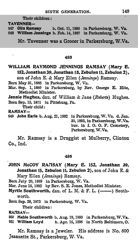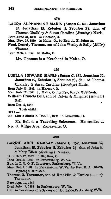 Family Tree Book - Descendants of Zebulon Sixth Generation, p. 149 - Descendant #482, shows the children of Carrie Adel Ramsay and Thomas O. Tavenner. |