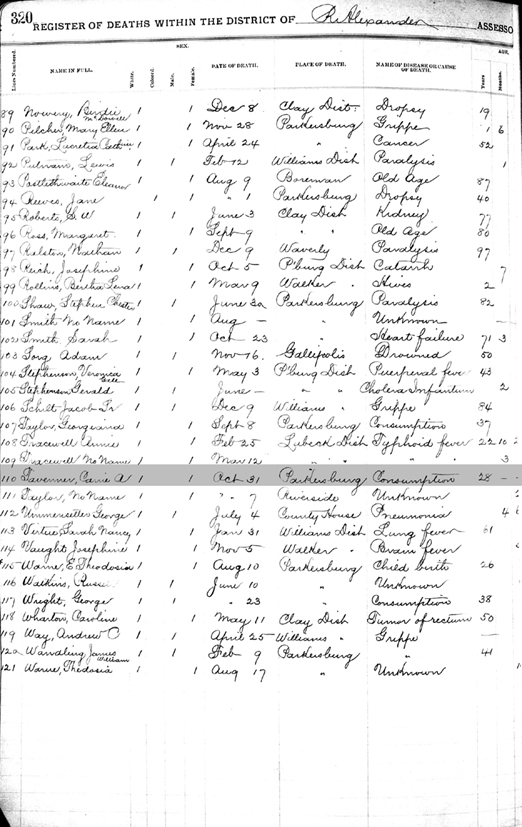 Register of Deaths Book, Wood County, West Virginia Page 320, Line 110 - Name: Carrie A. Tavenner; Date of Death: 31 Oct 1890; Place of Death: Parkersburg; Age at Death: 28 |