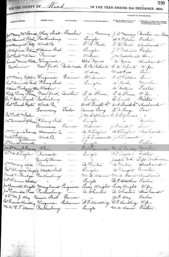 Register of Deaths Book, Wood County, West Virginia Page 320, Line 110 - Name of Parents: John E. & Mary E. Ramsey; Where Born: Ohio;Occupation: (None); Consort of, or Unmarried: Thomas Tavenner; Informant: Mary E. Ramsey, Mother |
