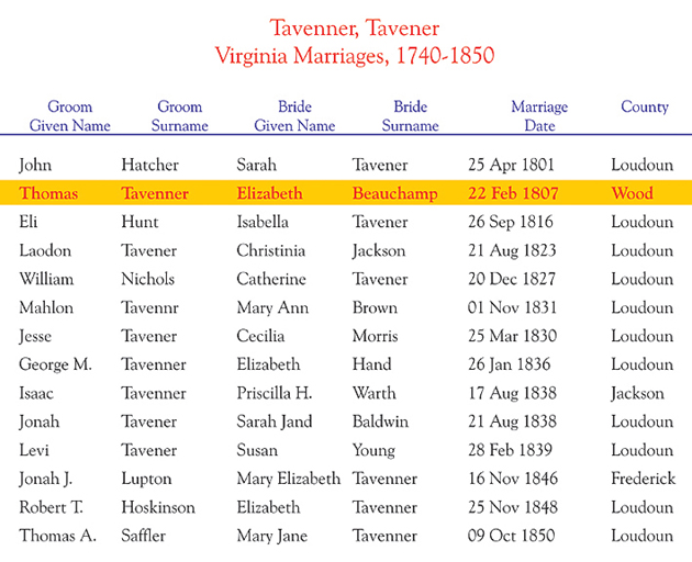 Virginia Marriages 1740 - 1850 Marriage of Thomas Tavenner and Elizabeth Beauchamp, 22 Feb 1807. Information found on internet. |