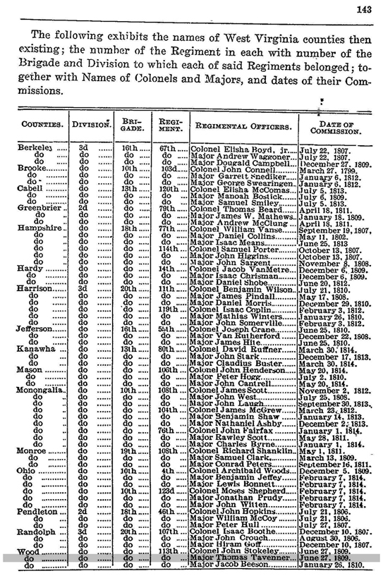 Book– West Virginia Soilders in the War of 1812 This table shows the County: Wood; Division: 3rd; Brigade: 20th; Regiment: 113th; Regimental Officers: Major Thomas Tavenner; and Date of Commission: June 27, 1809. |