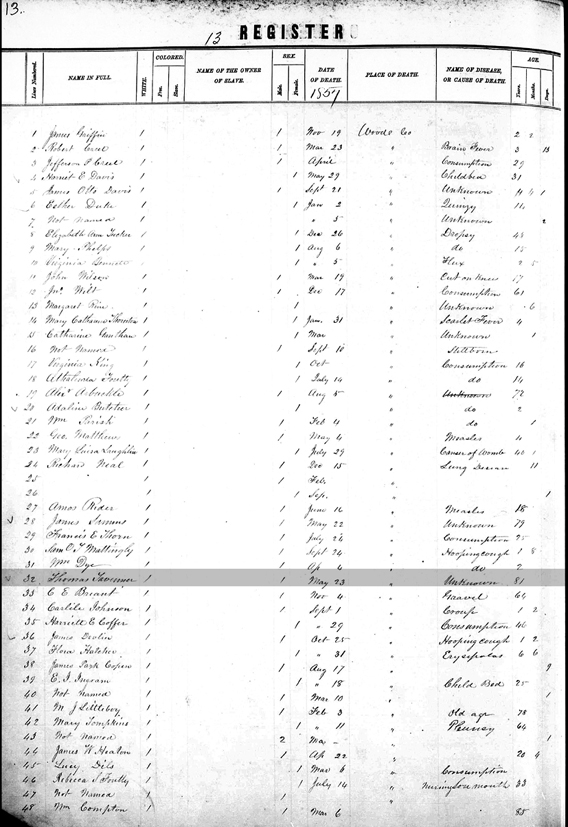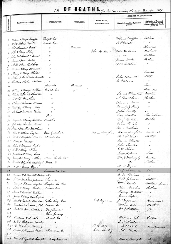 Register of Deaths Book, Wood County, West Virginia Before this image was available, the information on the page was previously copied directly from the book by Teresa Fordyce, and forwarded to me by e-mail. See the "Notes" section for that information. |