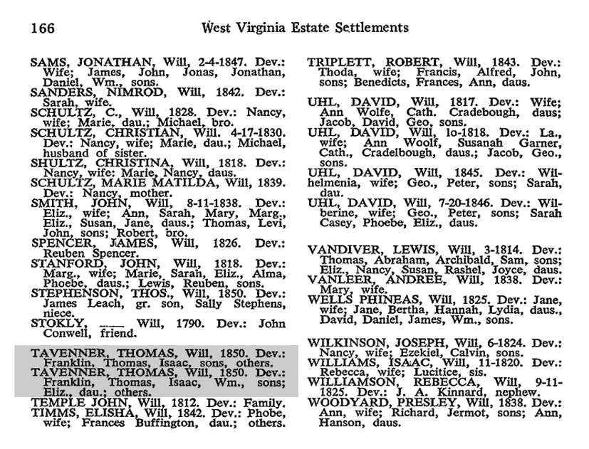 Book -- West Virginia Estate Settlements Page 166 -- Thomas Tavenner is listed twice. First with three of his sons, and then with all five children. |