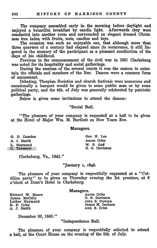 Page 262 -- Cabell Tavenner is listed as one of the Managers under the heading "Social Ball", The ball was held on New Years Eve in Clarksburg, Virginia, in 1841.
