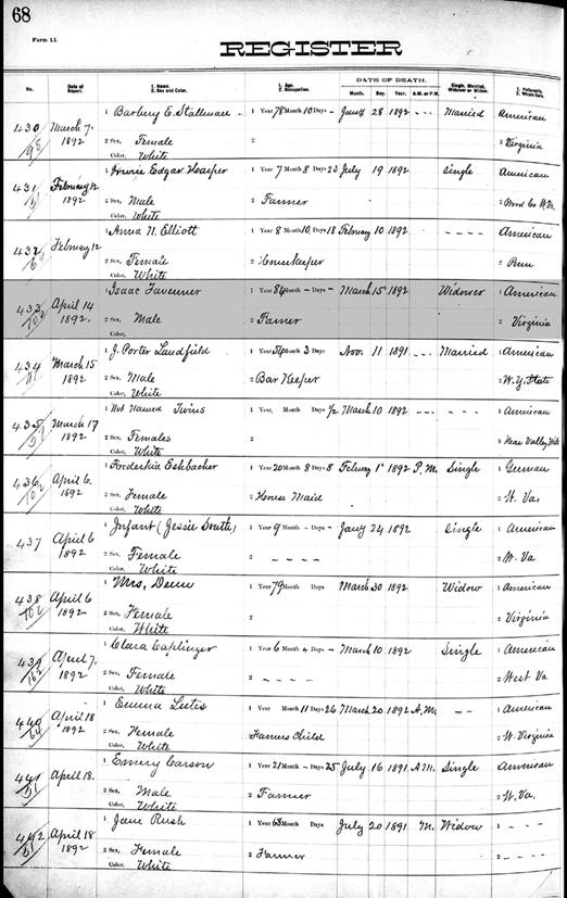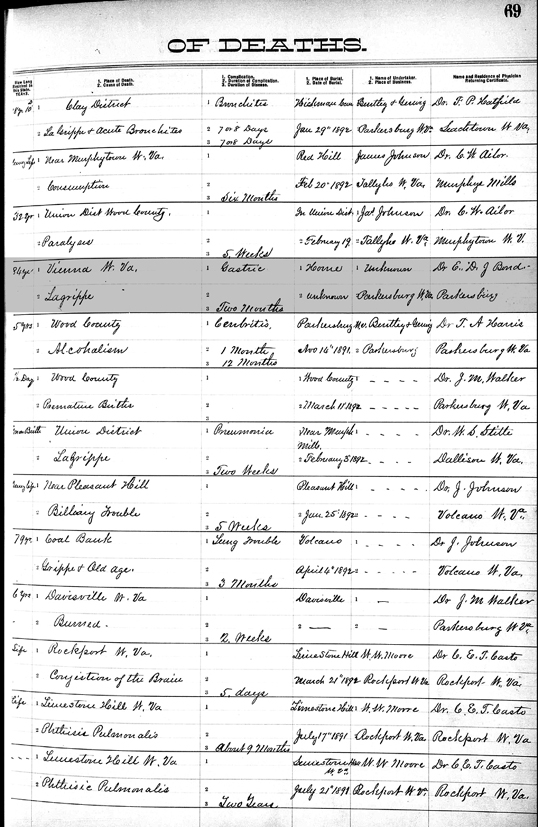 Register of Deaths Book, Wood County, West Virginia Before this image was available, the information on the page was previously copied directly from the book by Teresa Fordyce, and forwarded to me by e-mail. See the "Notes" section for that information. |