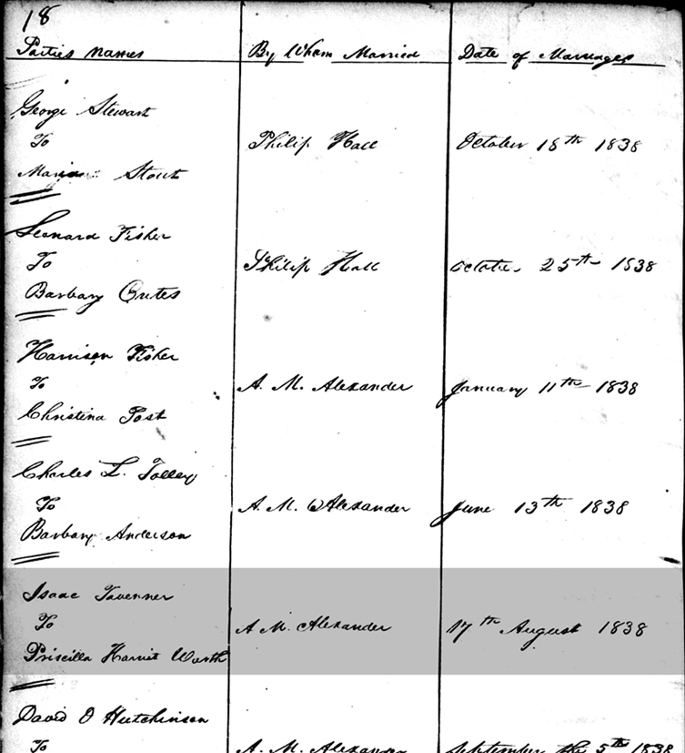 Register of Marriage Book, Jackson County, Virginia Page 18 - Parties names: Isaac Tavenner To Priscilla Harriet Warth; By Whom Married: A. M. Alexander; Date of Marriage: 17 August 1838. |