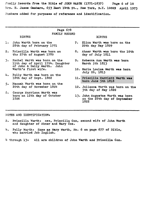 Family Records from the Bible of John Warth Text: “Priscilla Harriett Warth was born June 5th 1818”. Copied from the Warth family Bible by Mrs E. James Gambaro, in April 1973. |