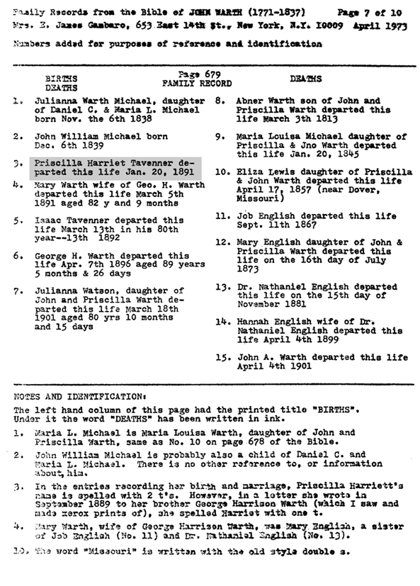 Family Records from the Bible of John Warth Text: “Priscilla Harriet Tavenner departed this life Jan. 20, 1891”.Copied from the Warth family Bible by Mrs E. James Gambaro, in April 1973. |