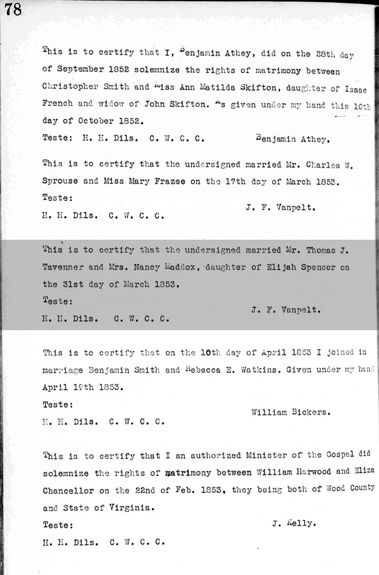Page 78 - Lists marriage of Thomas J. Tavenner and Mrs. Nancy (Spencer) Maddox on 31 March 1853. Marriage preformed by J. F. Vanpelt.