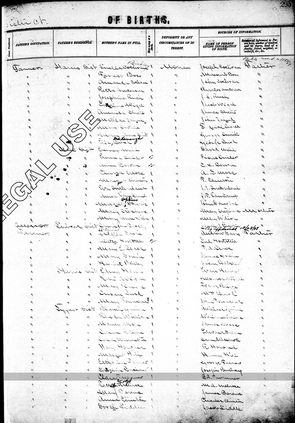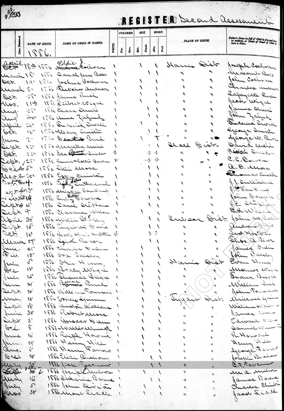 Register of Births Book, Wood County, West Virginia Page 295 (left side) - Date of birth: 20 May 1886; Name of child: Jesse Tavenner; Place: Tygart District; Name of father: B. F.Tavenner |