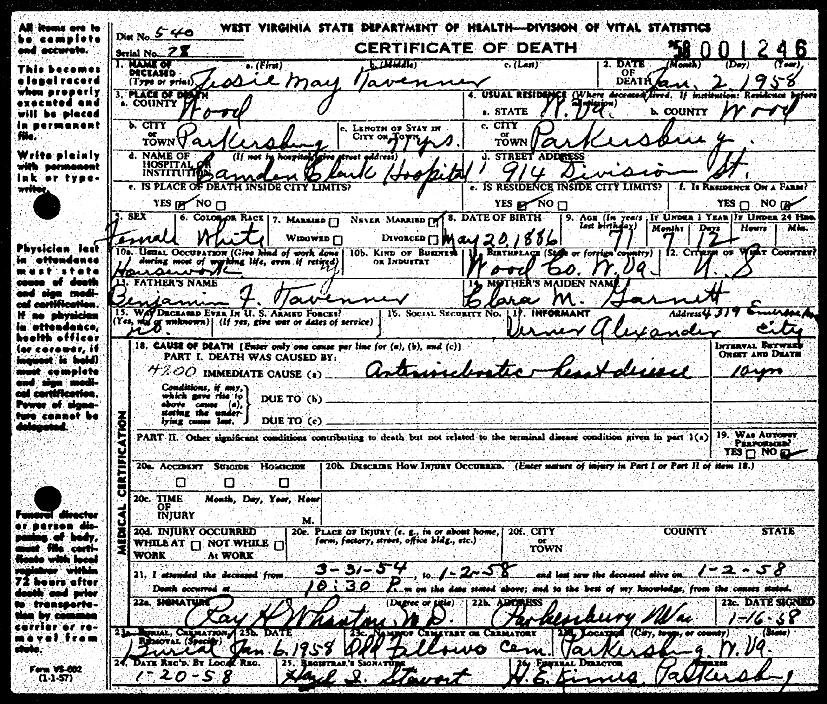 Original Certificate of Death, Wood County, West Virginia Death Certificate of Jessie May Tavenner. |