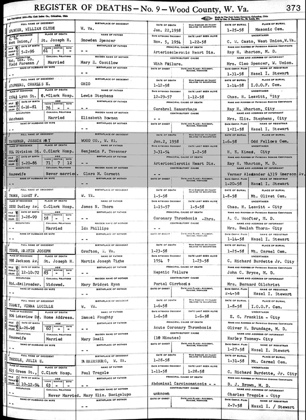 Register of Deaths Book No. 9, Wood County, West Virginia Before this image was available, the information on the page was previously copied directly from the book by Teresa Fordyce, and forwarded to me by e-mail. See the "Notes" section for that information. |
