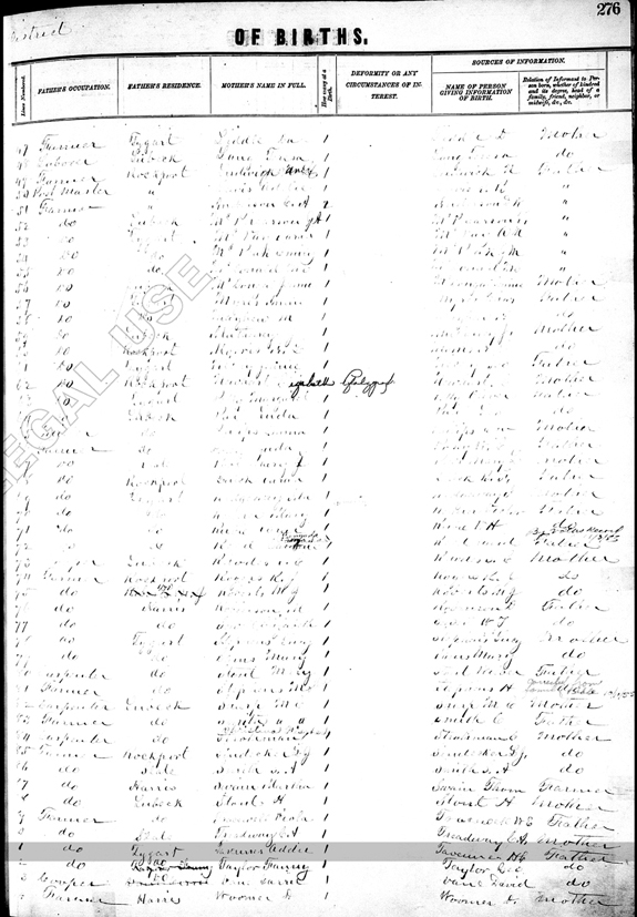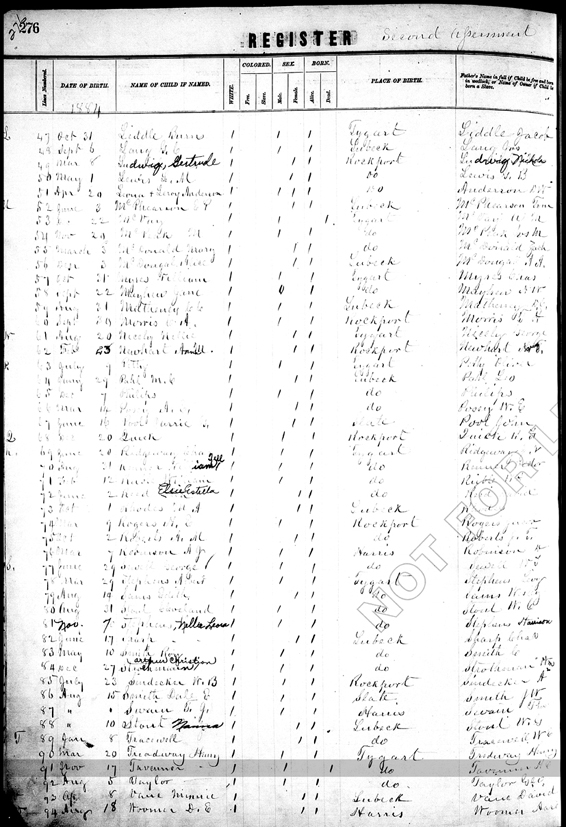 Register of Births Book, Wood County, West Virginia Page 276, Line 91 (left side) - Date: 17 Nov 1884; Name of child: –– Tavenner; Sex: Male; Born: Dead; Place: Tygart District; Name of father: H. C. Tavenner |