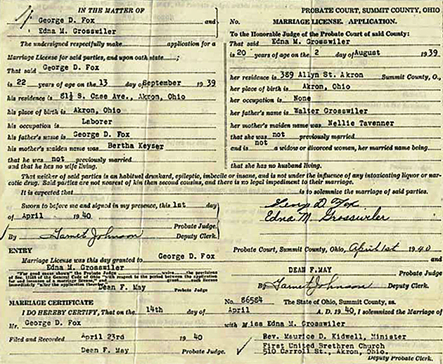 Marriage License and Certificate, Summit County, Ohio Marriage License and Minister's Certificate of George D. Fox and Edna Marie Grosswiler. Dated on 1 April 1940. Marriage performed on 14 April 1940 by Minister Maurice D. Kidwell, First United Brethern Church, Akron, Ohio. (Image contributed by Harry Fox) |