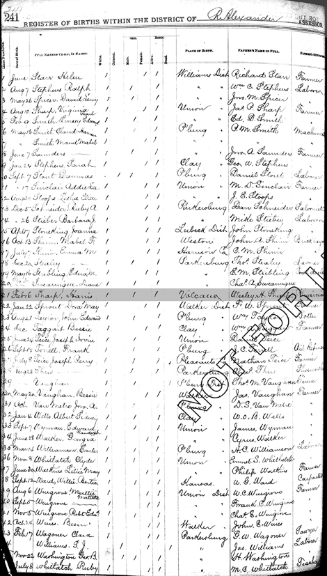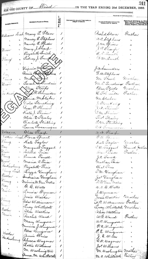 Register of Births Book, Wood County, West Virginia Page 241, Line 21 (left side) - Date: 16 Feb 1889 (Family Bible Record); Name of child: Harris Sharp; Place: Vocano, West Virginia; Name of father: Wesley H. Sharp; Occupation: Physician |