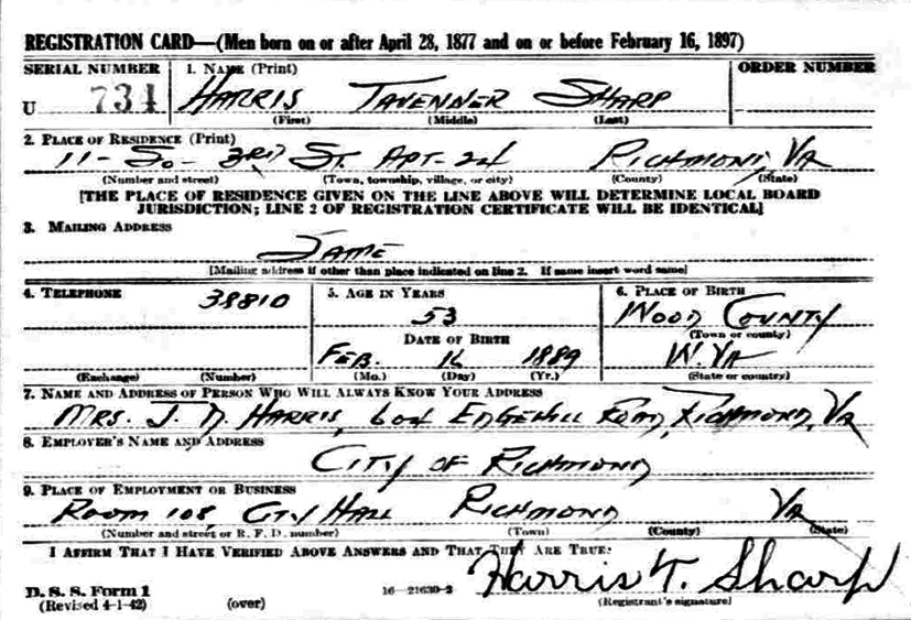 World War 2 - Military Registration Card Draft Card for Harris Tavenner Sharp. |