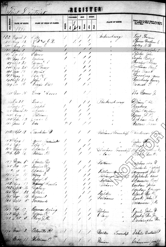 Register of Births Book, Wood County, West Virginia Page 147, Line 136 (right side) - Lists occupation of father: Grocer; Residence: Parkersburg; Name of mother: Sallie C.; Number at birth: 1; Person providing information: Father |