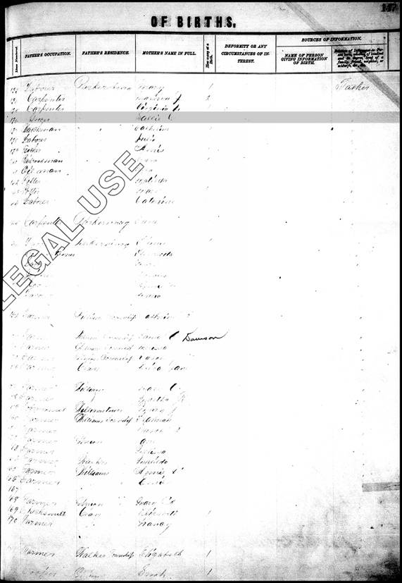 Register of Births Book, Wood County, West Virginia Page 147, Line 136 (left side) - Date: 3 Jun 1870; Name of child: Carrie; Place: Parkersburg; Name of father: John T. Tavenner |