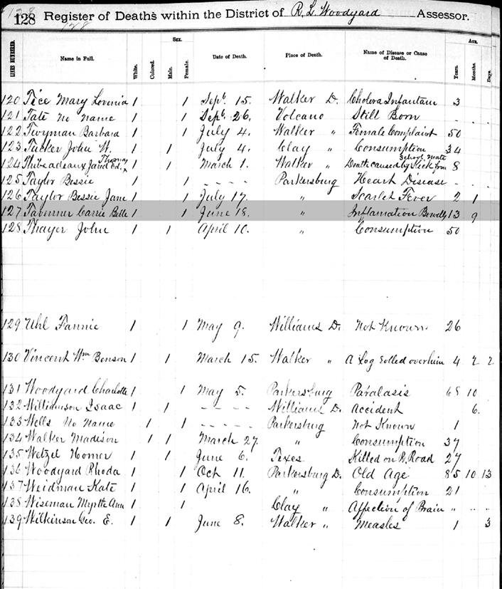 Register of Deaths Book, Wood County, West Virginia Page 128, Line 127 (left side) – Name: Carrie Belle Tavenner; Death of Death: 18 June 1883; Place of Death: Parkersburg; Cause of Death: Inflamation; Age: 13 years, 9 months |