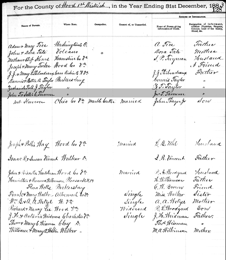 Register of Deaths Book, Wood County, West Virginia Page 128, Line 127 (right side) - Name of Parents: John T. & Sallie C. Tavenner; Where Born: Parkersburg; Source of Information: John T. Tavenner, Father |