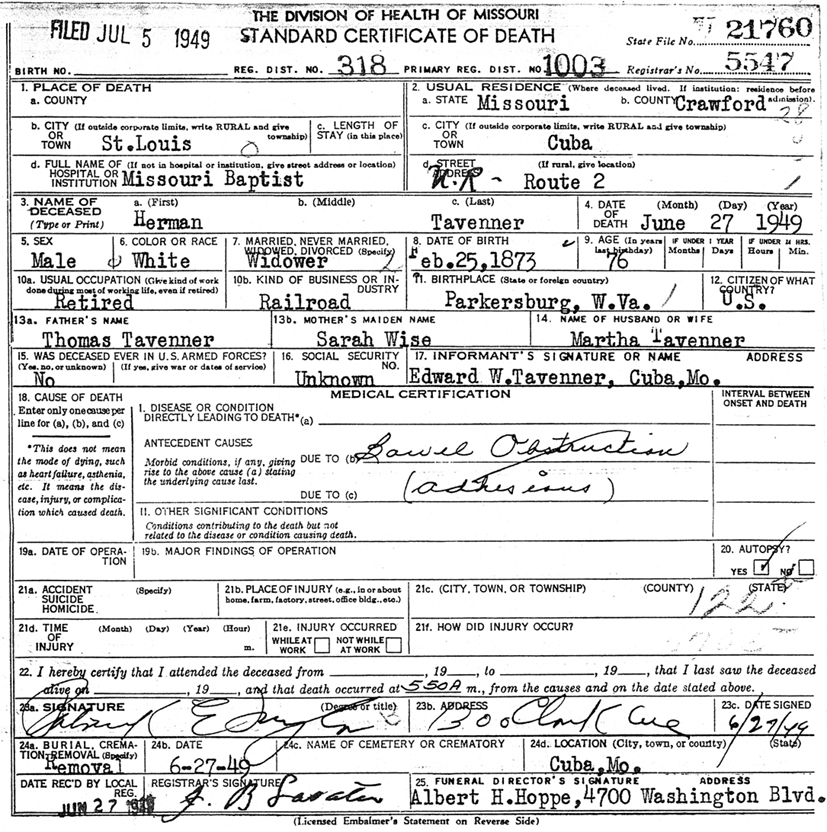 Certificate of Death Official Death Certificate of Herman Tavenner |